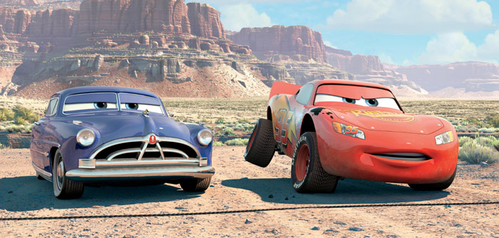Wir befinden uns auf der Rennpiste, wo der Hauptdarsteller eingeführt wird – Lightning McQueen ist sein Name und feuerrot seine Farbe. Ein ehrgeiziges junges Kerlchen, das es eilig hat, das nächste Rennen zu gewinnen. Das soll in Kalifornien stattfinden, und um die Pneus für das nächste Rennen zu schonen, wird er in einen Transporter verladen. Auf dem Highway in der Wüste kommt der Transporter ins Schleudern, unser Held findet sich in einer ihm fremden Gegend wieder, braust einfach drauf los und gelangt so eher unfreiwillig nach Radiator City. Das ist eine (auch vom automotiven) Fortschritt vergessene kleine Stadt an der „alten“ Traumstraße Route 66 mitten in einer gigantisch-schönen Sandstein-Landschaft gelegen. Mit diesem Abstecher in eine nostalgisch-schöne Welt verlangsamt sich auch das Tempo des Films. Niemand droht hier mehr, aus den erzählerischen Kurven zu fliegen. Elegant wechselt das Erzähltempo, der filmische Fahrgenuss steigert sich unentwegt.