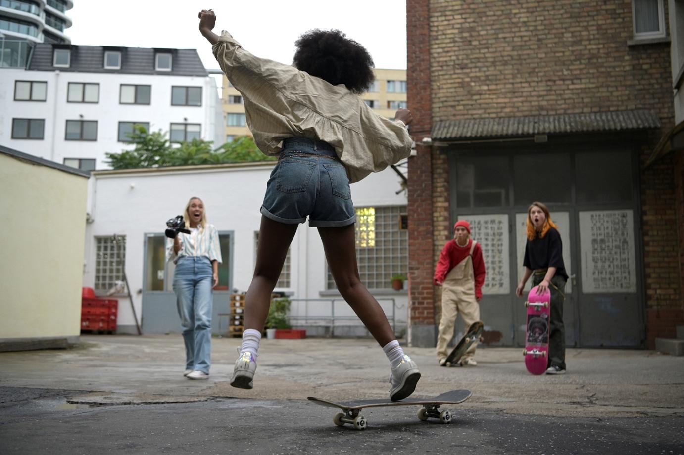 Mit ihrem Film GET UP feiern die Regisseurin Lea Becker und ihre Co-Drehbuchautor:innen Alexander Dydyna und Christine Heinlein ihre großartigen Hauptfiguren, allesamt junge unabhängige Frauen, die sich ihren Platz im Leben suchen und dabei aus ihrer Freundschaft und ihrem Zusammenhalt eine große Stärke ziehen. Dabei nimmt der Film die Geschichte jeder Figur ernst und zeigt auf, mit welchem Druck auch und gerade diese Generation umgehen muss. Die Erwartungshaltung der Eltern, Versagensängste und das emotionale Gefühlschaos rund um Freundschaft und Liebe – in GET UP wird all das erzählt, ohne dass die Leichtigkeit und Coolness der Geschichte verloren gehen. Dazu fängt die phänomenale Kamera von Karl Kürten die Skater-Szenen perfekt ein und bildet nicht nur die gesamte Power dieses Sports ab, sondern lässt auch ein sommerlich-sonniges Feeling zwischen der ikonischen Frankfurter Skyline und kleinen, noch wenig filmisch eingefangenen Straßen und Ecken entstehen. Der weibliche Hauptcast (in den Hauptrollen unter anderem die bekannten Influencer-Zwillinge Lena und Lisa Mantler) harmoniert ganz wunderbar miteinander, das Spiel der jungen Frauen wirkt völlig natürlich. Auch das bewusste Setzen auf Diversität, Queerness und Female Empowerment vermittelt sich mit extrem lockerer Selbstverständlichkeit, unterstützt von einem Soundtrack, der Lust auf Sommer und Skaten macht.