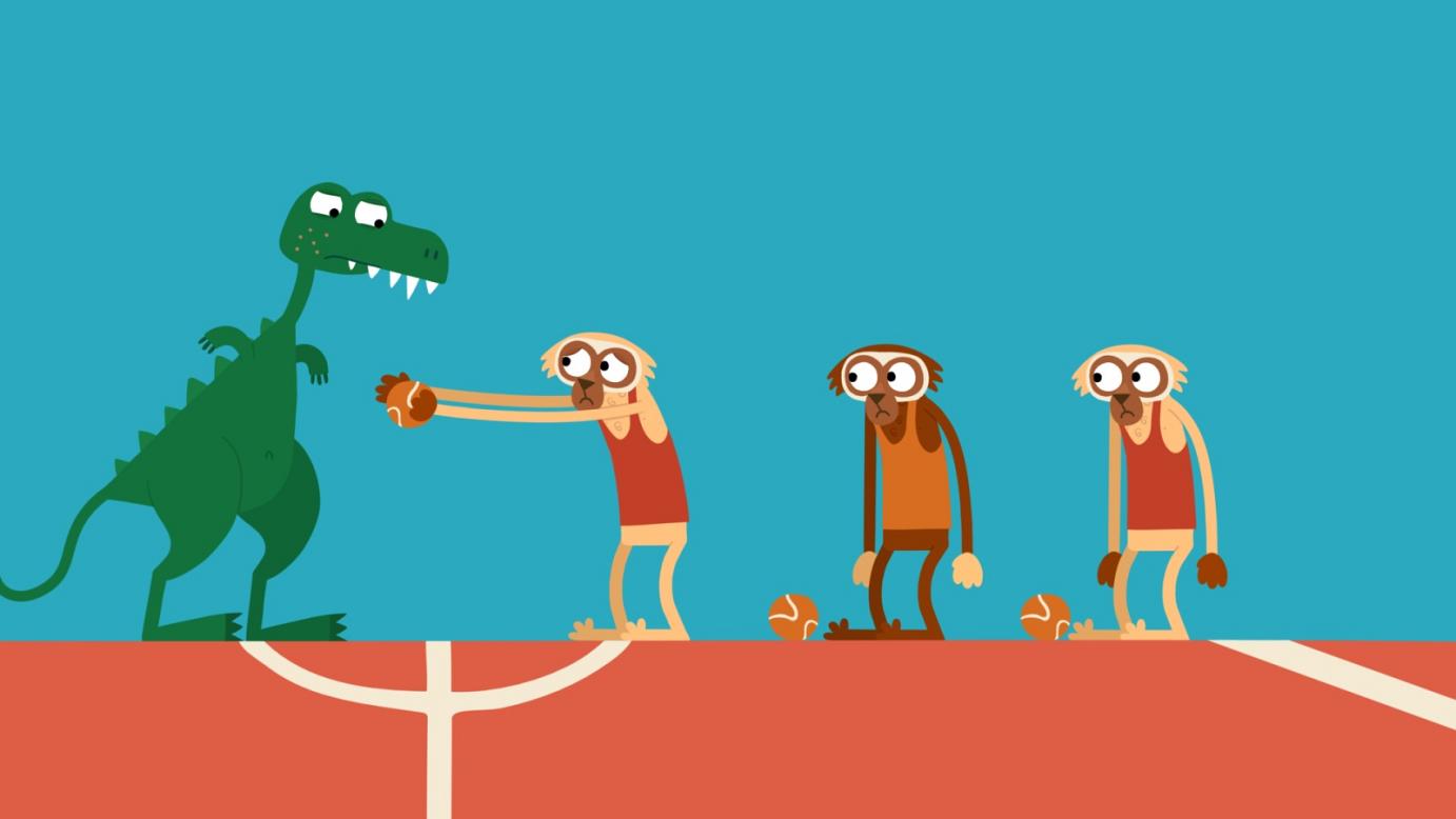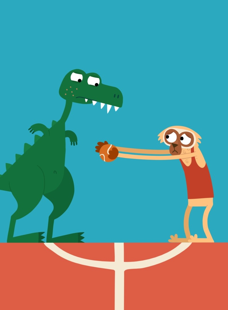 Sie sind groß, stark und gefährlich. Seit Jahrzehnten lieben Vorschulkinder Dinosaurier. Und der, der fast immer die größte Beachtung findet, ist der T-REX. Kein Wunder also, wenn so ein Dino auch gerne mal in Kinderfilmen auftaucht. In Julia Ockers Kurzanimation hat es solch ein Exemplar allerdings nicht so leicht. Ihr T-REX kommt schnell an die Grenzen seiner Fähigkeiten, als er es im Basketball mit Affen aufnehmen soll.Stummelärmchen taugen einfach nicht zum Ballspiel und das eine oder andere Jurymitglied fühlte sich bisweilen an den eigenen Sportunterricht erinnert. Dennoch aber konnte die Jury herzlich über die vergeblichen Bemühungen des liebenswürdigen Urzeitreptils lachen. Mit warmen Farben und einfacher Textur hat Ocker ein so angenehmes Setting für das Ballspiel des T-REX geschaffen, dass das Scheitern des Helden nicht ganz so schlimm scheint. Und dennoch sind ihm sein Kontrahenten haushoch überlegen. Was der große Dino auch versucht, es geht schief. Nicht einmal der Trainer vermag da zu helfen. Wut, Verzweiflung, Traurigkeit: Trotz reduzierter Animation ist das Gefühlsleben des Urtieres gut ablesbar, seine liebenswert-großen Glupschaugen sprechen Bände.